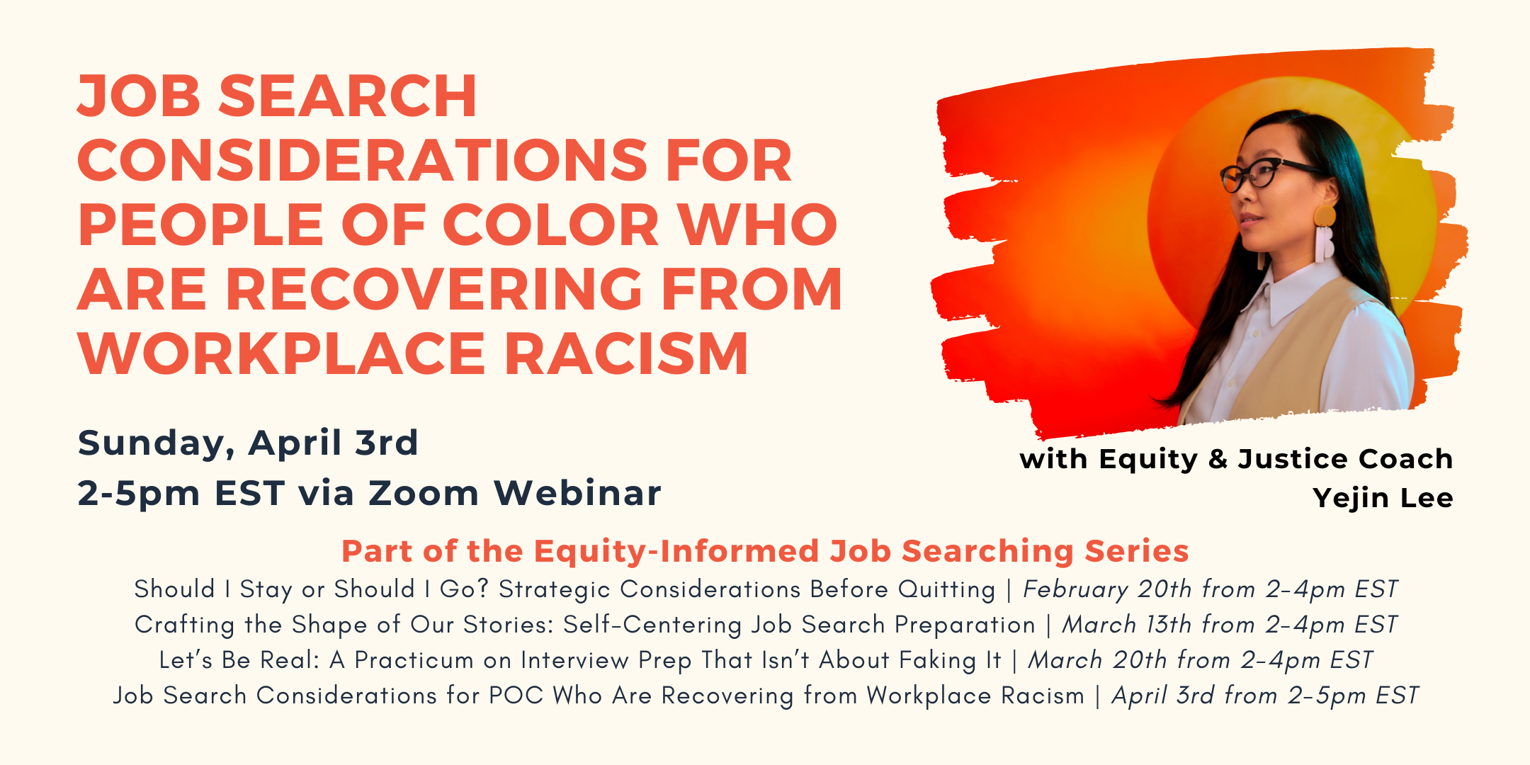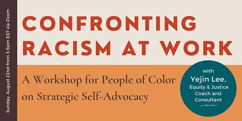During this free 3-hour workshop, Yejin will be offering people of color a tangible strategic framework to more safely respond to experiences of racism in the workplace. A deeply upsetting and unsettling reality of white dominance is that people of color are almost always the ones burdened with being deliberate, measured, and strategic after experiencing racism at work. Yejin hopes to account for this ugly truth by equipping their BIPOC comrades with some new tools, skills, and analyses, and to support them in finding approaches to self-advocacy that are grounded in their identities, experiences, triggers, defaults, subjectivities, perspectives, and needs. During the workshop, she will be addressing how folks with differing defaults & personalities may need to rely on very different approaches to addressing racism in the workplace. She will also discuss the power of collective organizing in workplaces.